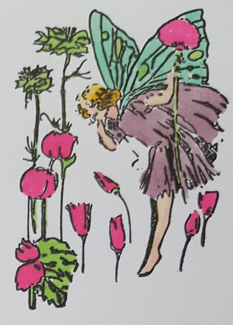 The first fairy stamped really nicely. The lines were clean and I could easily see what I needed to do to colour the image. The second fairy I found harder, either my stamp was not as good quality or the drawing was not as clear, have a look at it and see what you think? The third one was similar to the second.